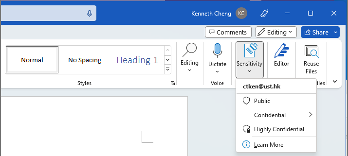 The sensitivity label, HKUST Restricted, is used when you wish to protect documents such that only HKUST (CWB) staff members (with email addresses ending with @ust.hk) can open them to read or write. Users other than HKUST (CWB) staff members will not be able open the documents protected by HKUST Restricted. It is a fast and simple way to protect documents for use by HKUST (CWB) staff members.