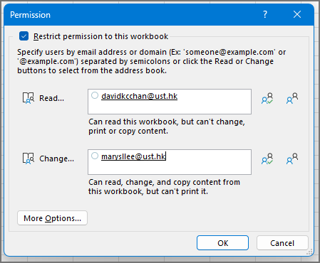 Notes: In HKUST, all users are using their email accounts (not email aliases) to login to Microsoft Office. However, some external users are not using their email addresses to login to Microsoft Office. You will need to ask your users which Microsoft accounts they are using to login to Microsoft Office before entering their accounts when protecting documents with MIP.