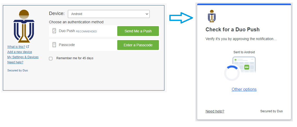 If you ever want to choose a different way other than the one chosen, click Other options near the bottom. Below is the upcoming change from a Duo traditional prompt to a Duo Universal Prompt: