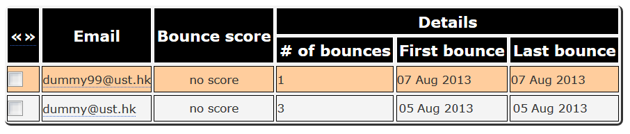 When there is a problem with subscribers' email addresses (obsolete email addresses, addresses temporarily unavailable when messages were sent, inbox quota exceeded, etc.), the percentage of bouncing addresses displays in the left menu under the text 'Error rate'. To check the bouncing addresses, go to the 'Bounces' page.