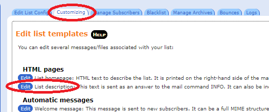 The list description (private information) is optional but if you would like to have a longer description of how your list is to be used in more detail, you may make or modify the list's long description. From the left hand column select your list and select . Then select Customizing. Click the Edit button next to List description. Once done click Save at the bottom. To verify click on Info in the left hand column and it will show the description.